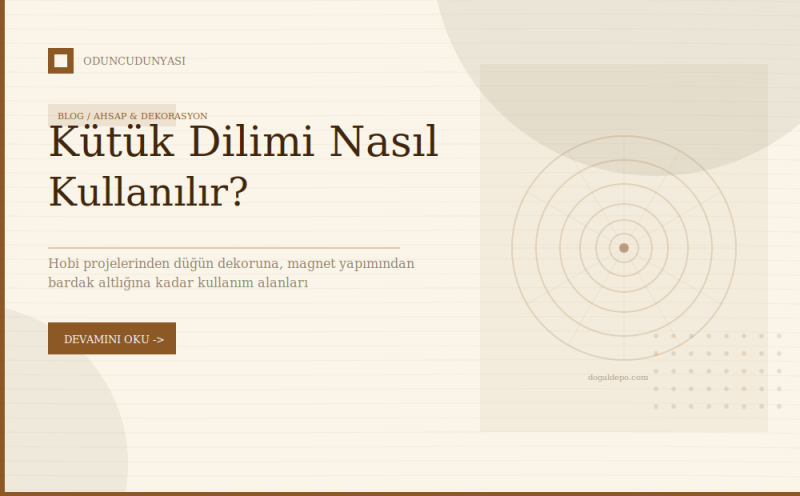 Dogaldepo.com, Oduncudünyası doğal ahşap ürünler, dekoratif hobi malzemeleri ve kişiye özel tasarım ürünleri sunan bir e-ticaret mağazasıdır. Doğal ahşap kütük dilimi, odun dilimi, dekoratif bardak altlığı, ahşap magnet, anahtarlık, lazer kesim dekor ürünleri ve ev dekorasyon ürünleri gibi birçok farklı ürünü uygun fiyatlarla bulabilirsiniz.